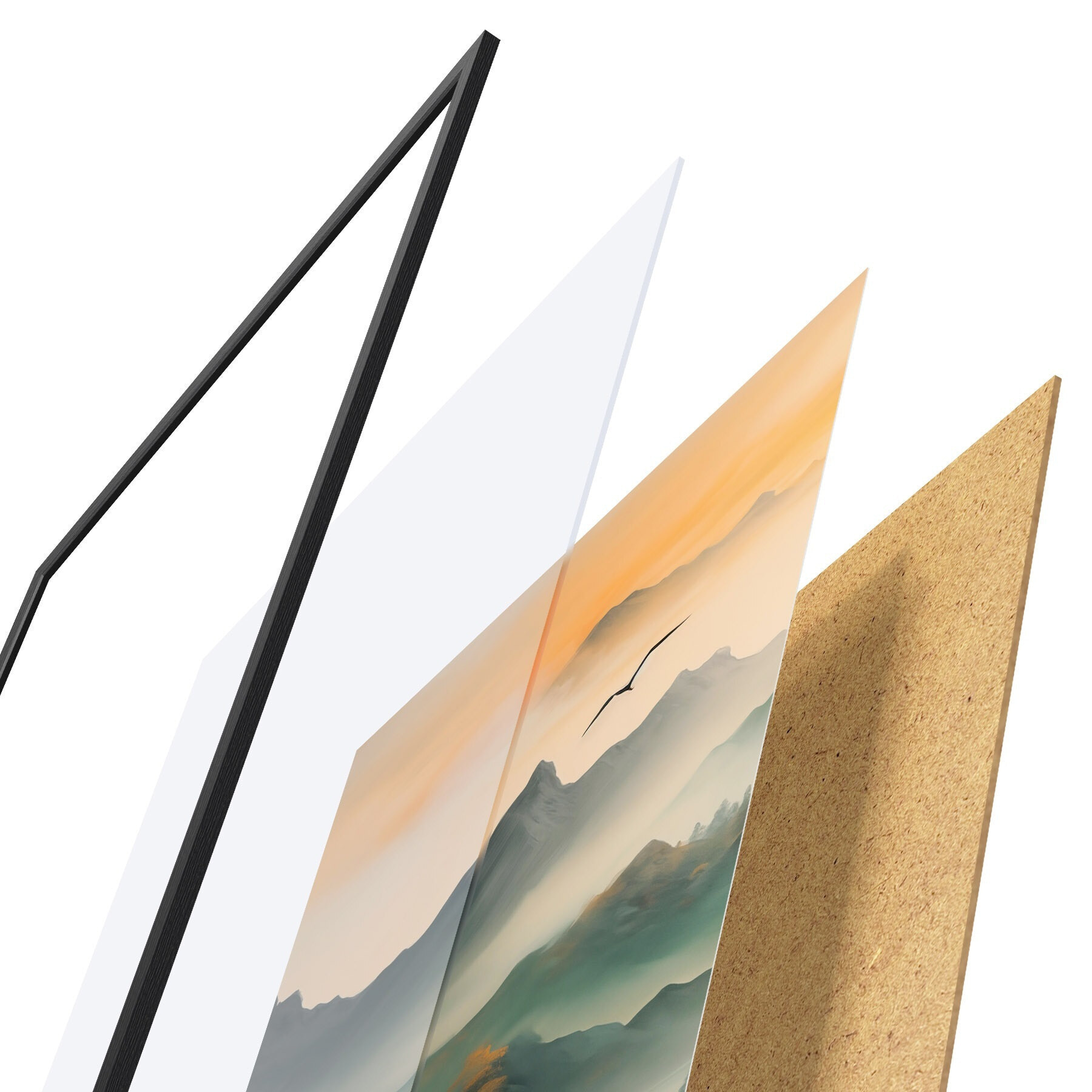 Le poster se compose d'un cadre, d'un plexiglas, d'une image imprimée et d'un support en aggloméré. Le poster peut être immédiatement accroché au mur grâce aux fixations au dos.