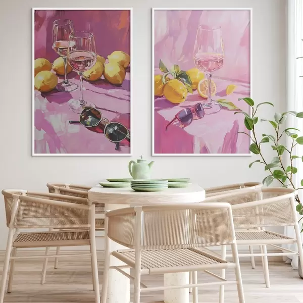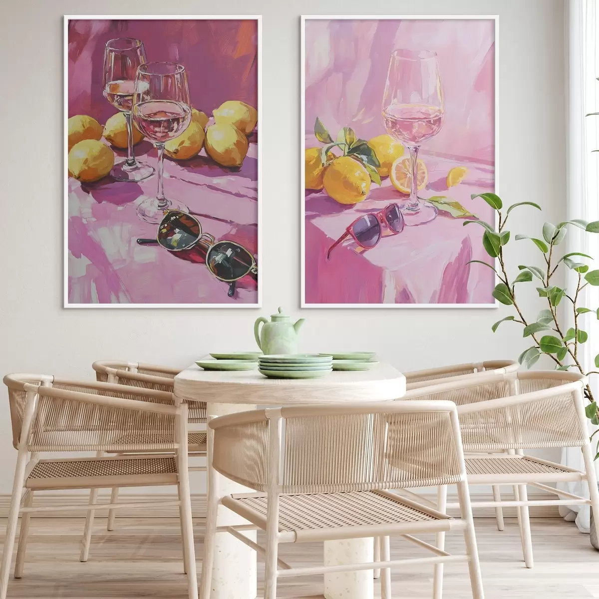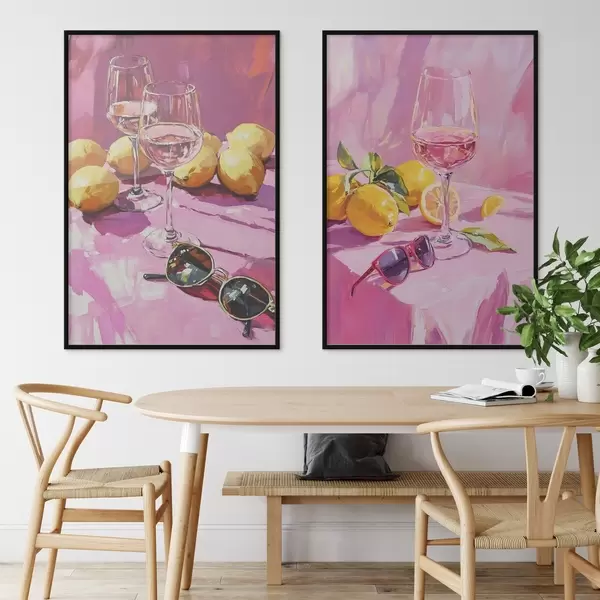 Affiche Abstraction à l'huile avec des coupes de champagne, des citrons et des lunettes de soleil, couleurs roses d00444