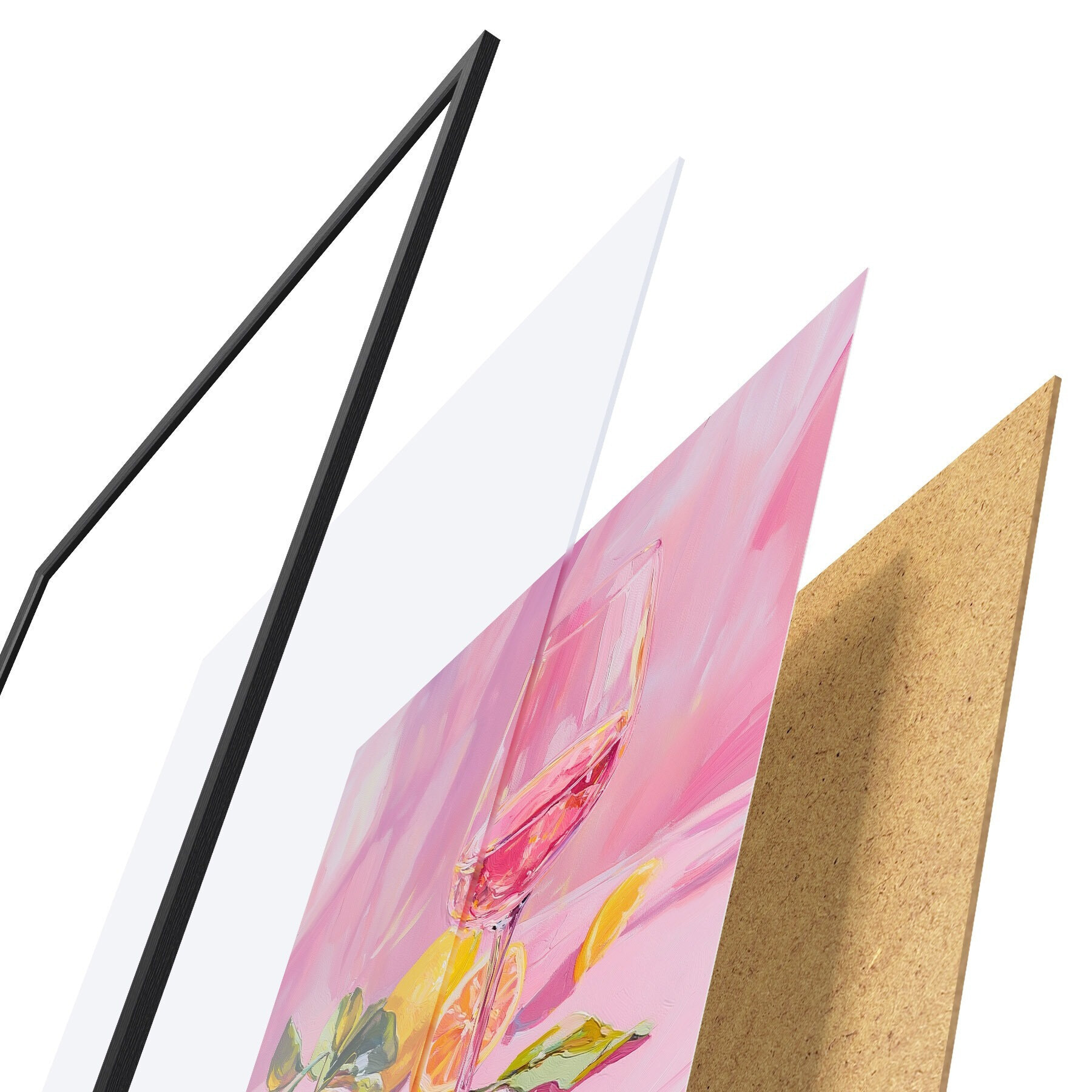 Affiche Abstraction à l'huile avec des coupes de champagne, des citrons et des lunettes de soleil, couleurs roses Non d00444