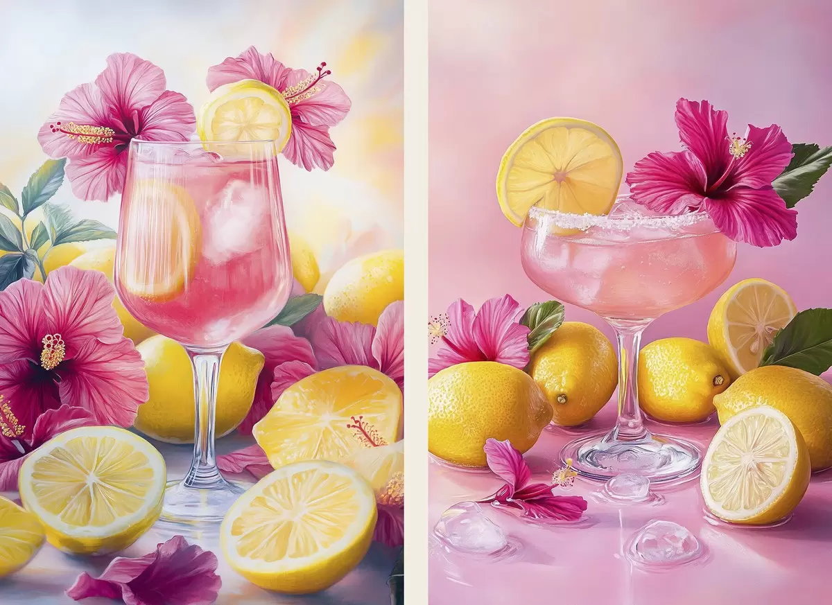 Affiche Cocktails avec des fleurs d'hibiscus et des citrons, été, juteux, style aquarelle d00446