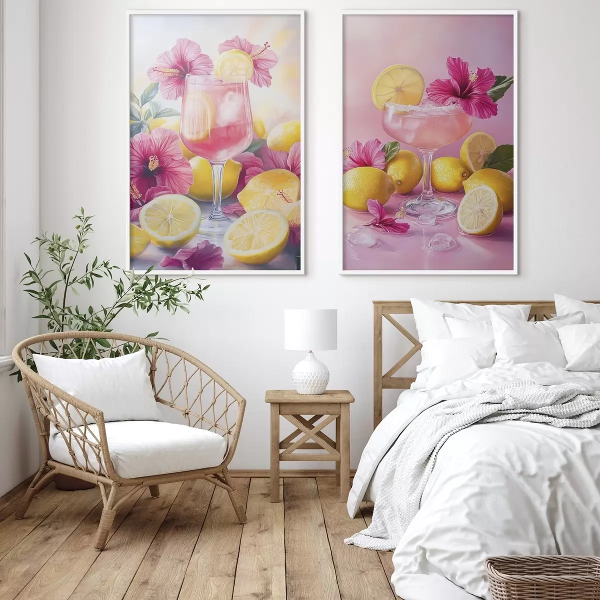 Affiche Cocktails avec des fleurs d'hibiscus et des citrons, été, juteux, style aquarelle Non d00446