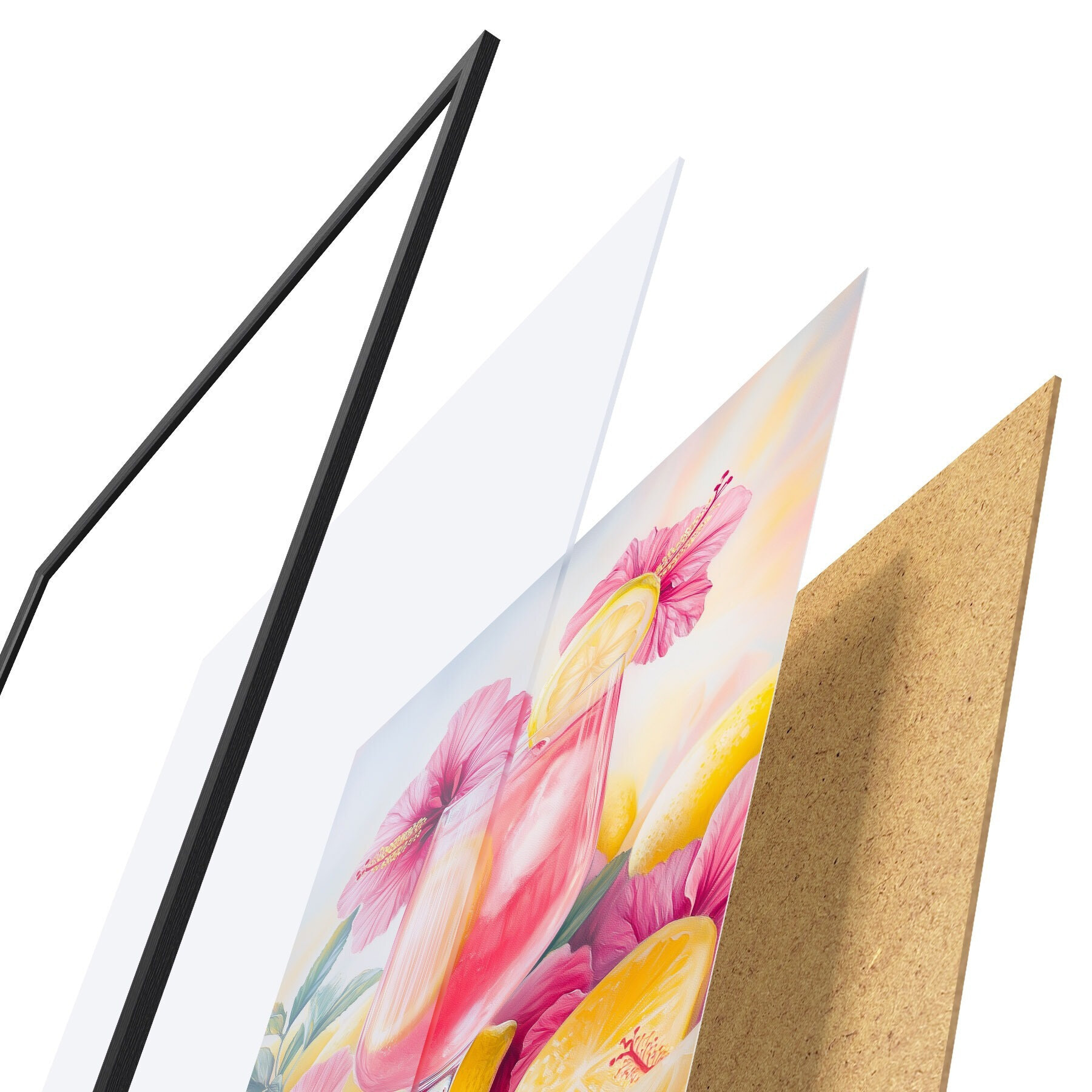 Le poster se compose d'un cadre, d'un plexiglas, d'une image imprimée et d'un support en aggloméré. Le poster peut être immédiatement accroché au mur grâce aux fixations au dos.