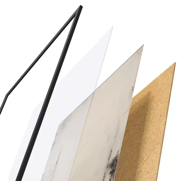 Le poster se compose d'un cadre, d'un plexiglas, d'une image imprimée et d'un support en aggloméré. Le poster peut être immédiatement accroché au mur grâce aux fixations au dos.