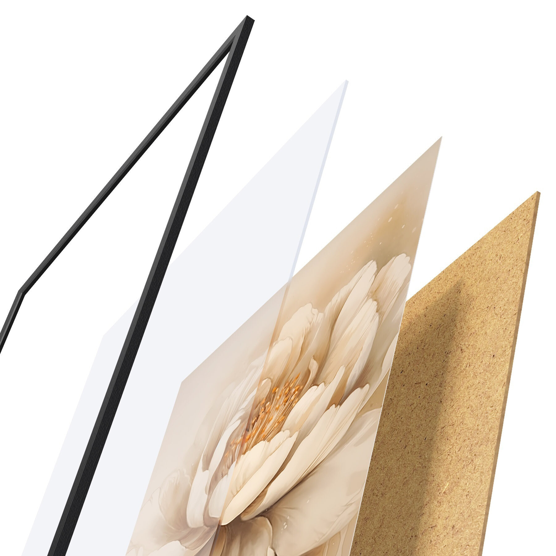 Le poster se compose d'un cadre, d'un plexiglas, d'une image imprimée et d'un support en aggloméré. Le poster peut être immédiatement accroché au mur grâce aux fixations au dos.