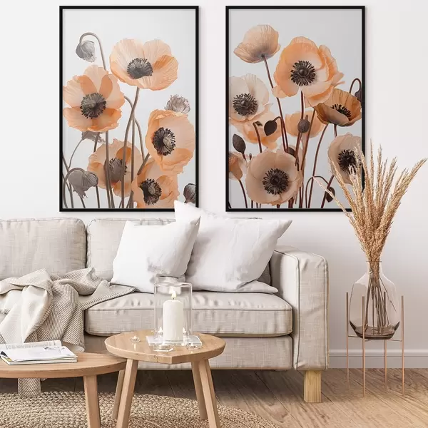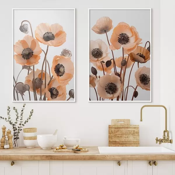 Affiche Coquelicots orange, fleurs séchées sur fond clair, éclairage doux, pétales délicats, arrangement floral Non d00518