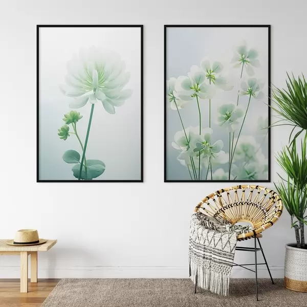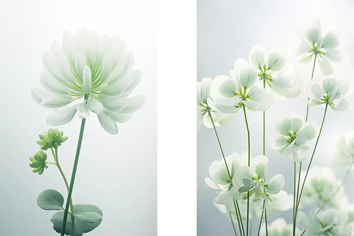 Affiche Fleurs de trèfle blanc avec tige et feuilles vertes, éclairage doux, arrière-plan propre, composition minimaliste, botanique d00520