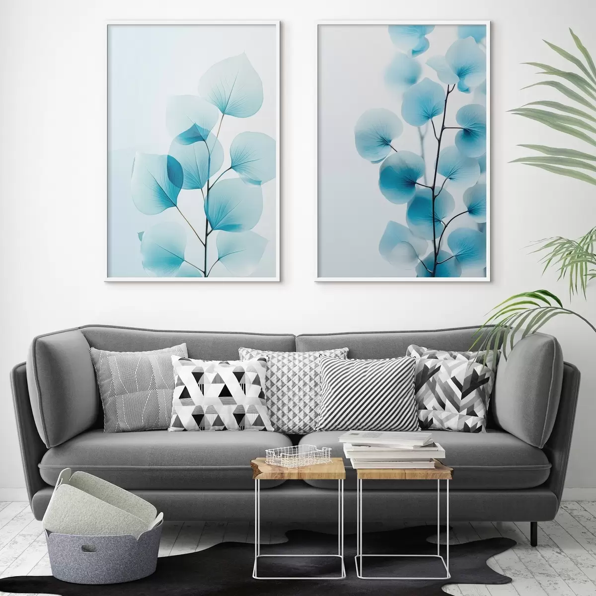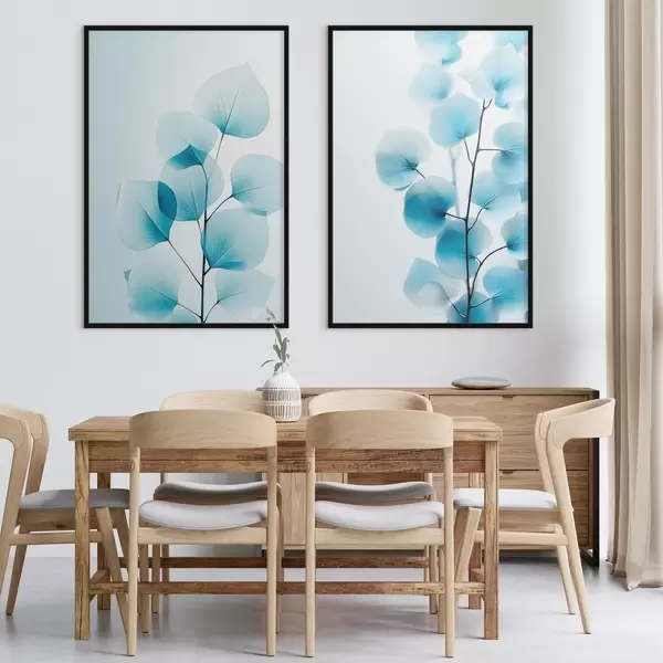 Affiche Branche avec des feuilles bleues translucides, veines délicates visibles, composition légère et calme, esthétique minimaliste Non d00522