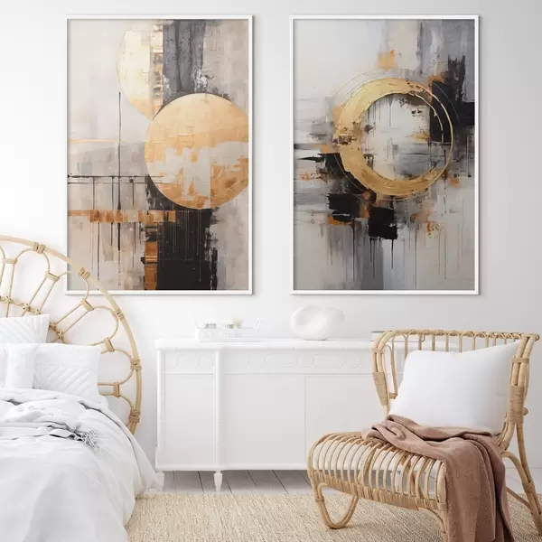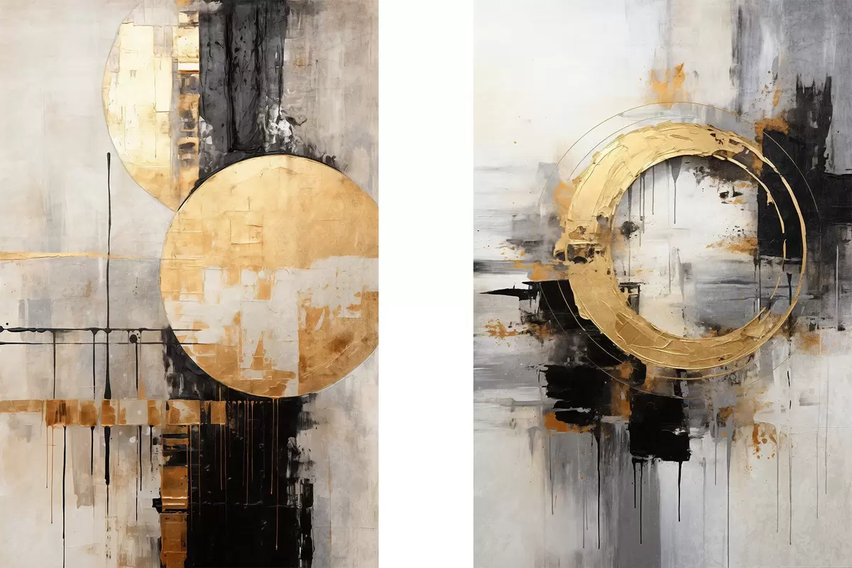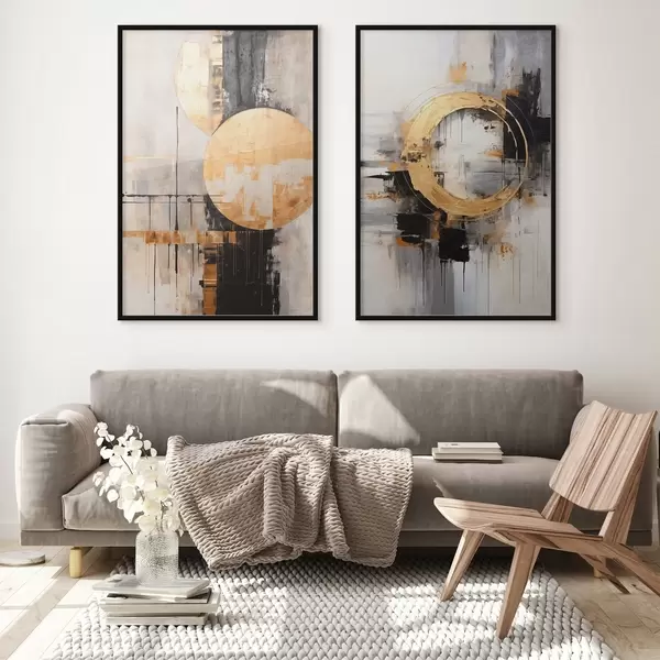 Affiche Peinture abstraite avec des cercles, des lignes noires et jaunes, et un arrière-plan dans les tons gris et blancs Non d00527