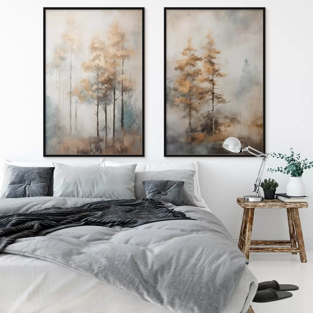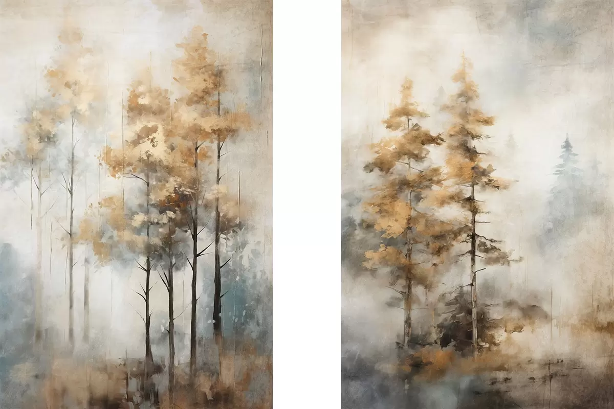 Affiche Grands arbres texturés avec des feuilles jaunes dans une forêt, l'arrière-plan est un mélange de tons bleus et bruns doux Non d00528