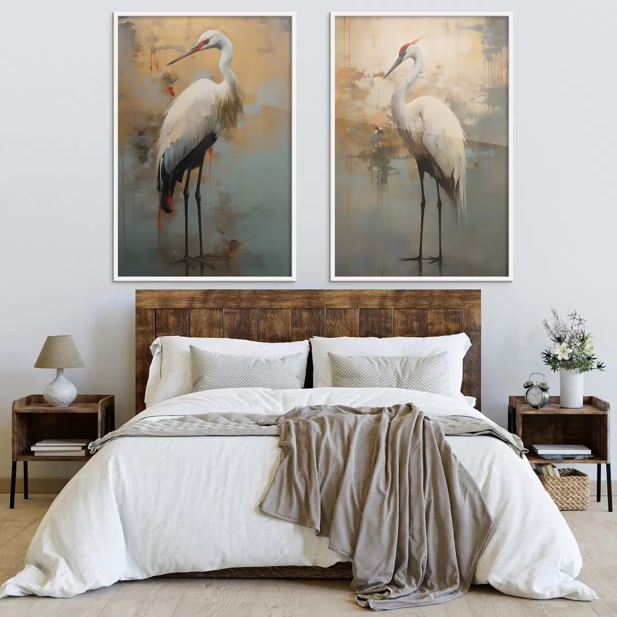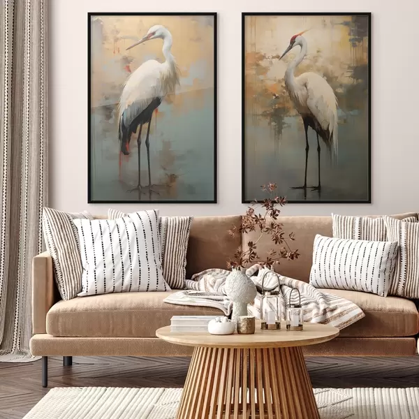 Affiche Héron blanc sur fond de teintes jaunes, brunes et bleues atténuées suggérant un paysage brumeux et abstrait Non d00530