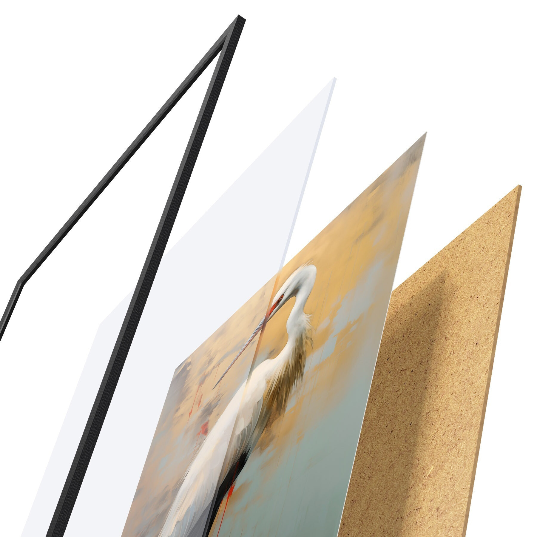 Le poster se compose d'un cadre, d'un plexiglas, d'une image imprimée et d'un support en aggloméré. Le poster peut être immédiatement accroché au mur grâce aux fixations au dos.