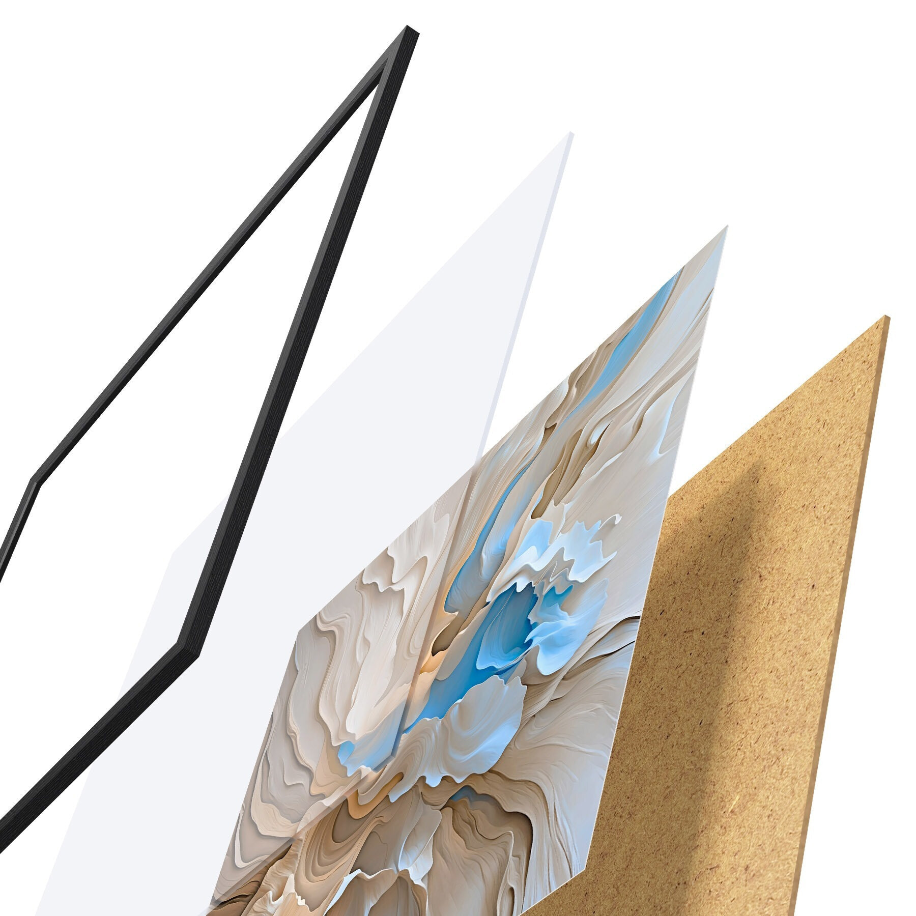 Le poster se compose d'un cadre, d'un plexiglas, d'une image imprimée et d'un support en aggloméré. Le poster peut être immédiatement accroché au mur grâce aux fixations au dos.