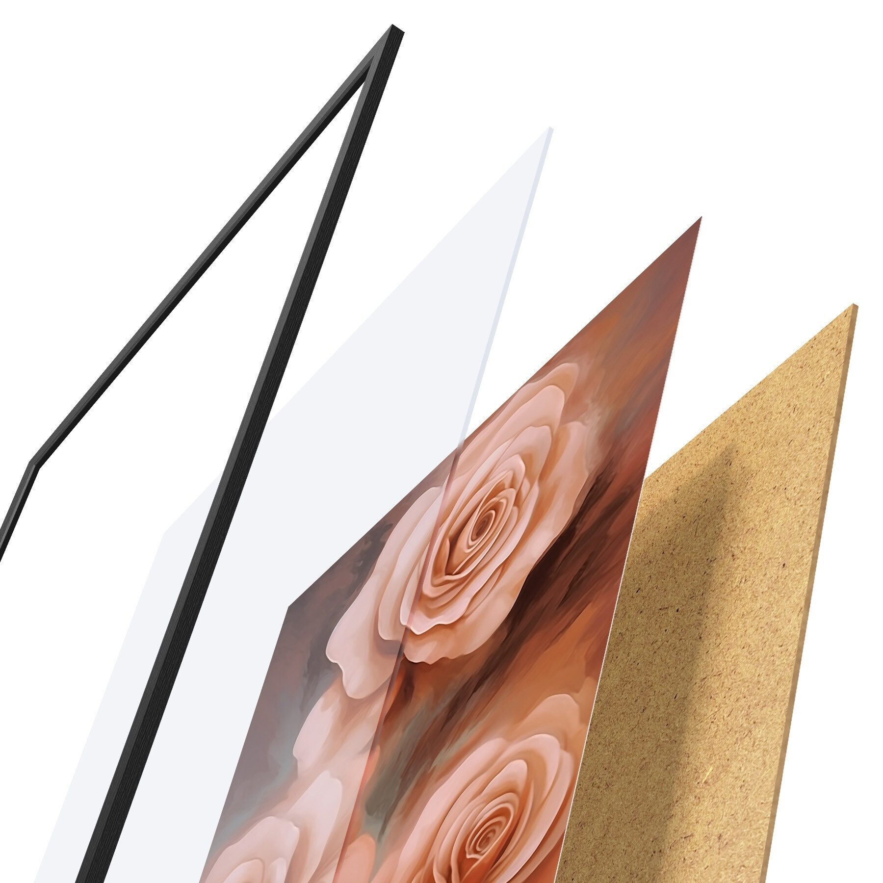 Le poster se compose d'un cadre, d'un plexiglas, d'une image imprimée et d'un support en aggloméré. Le poster peut être immédiatement accroché au mur grâce aux fixations au dos.