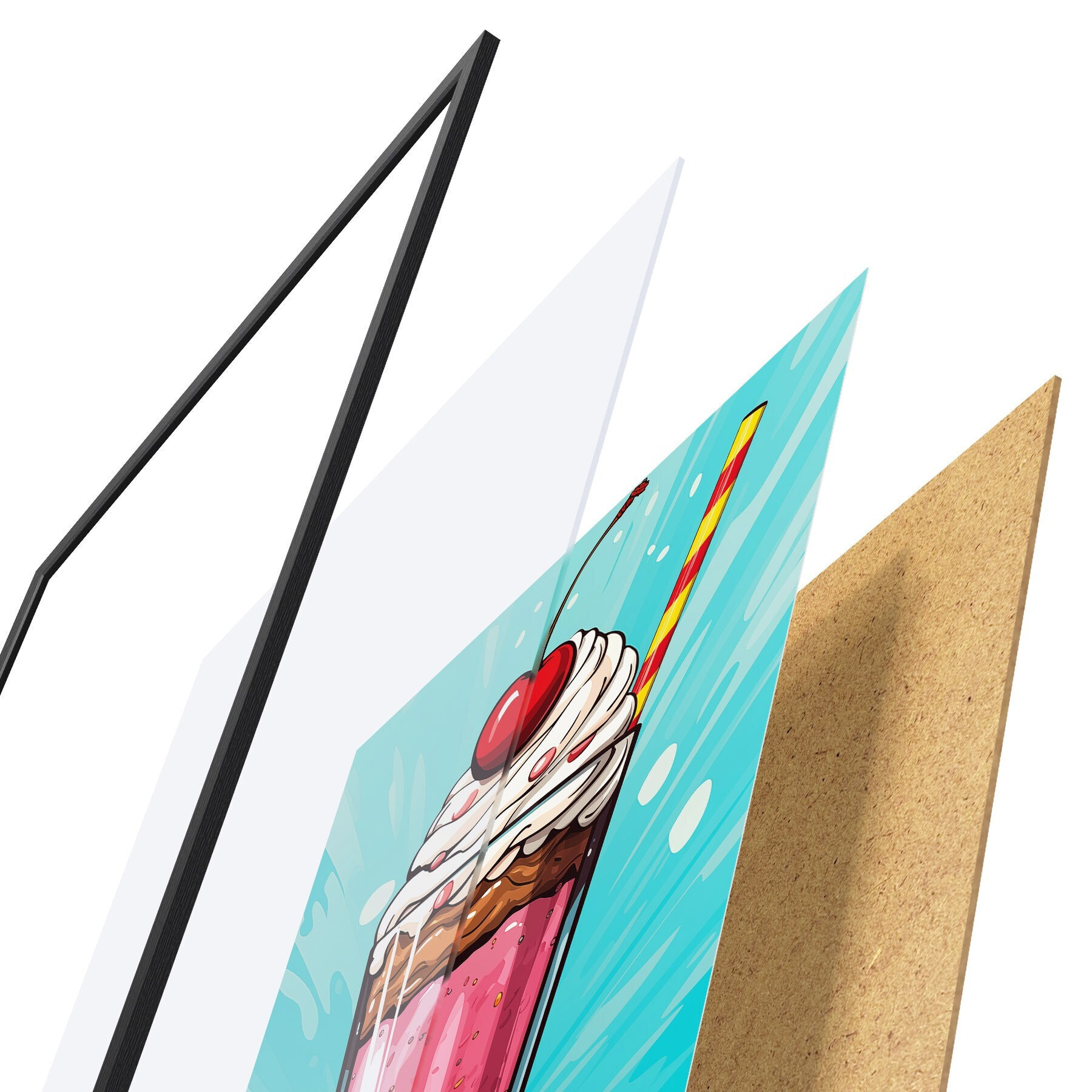 Le poster se compose d'un cadre, d'un plexiglas, d'une image imprimée et d'un support en aggloméré. Le poster peut être immédiatement accroché au mur grâce aux fixations au dos.