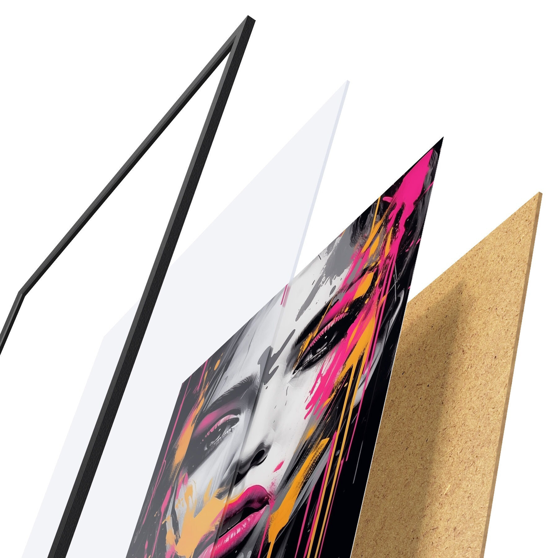 Le poster se compose d'un cadre, d'un plexiglas, d'une image imprimée et d'un support en aggloméré. Le poster peut être immédiatement accroché au mur grâce aux fixations au dos.