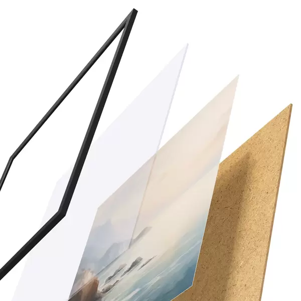 Le poster se compose d'un cadre, d'un plexiglas, d'une image imprimée et d'un support en aggloméré. Le poster peut être immédiatement accroché au mur grâce aux fixations au dos.