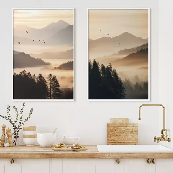 Affiche Un paysage de montagne avec une forêt et des oiseaux volant dans le ciel, le tout recouvert d'une épaisse couche de brouillard au lever du soleil Non d00651