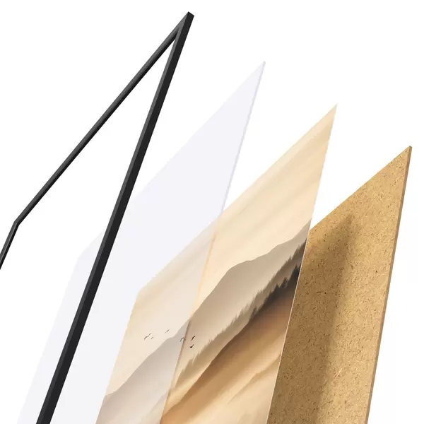 Le poster se compose d'un cadre, d'un plexiglas, d'une image imprimée et d'un support en aggloméré. Le poster peut être immédiatement accroché au mur grâce aux fixations au dos.