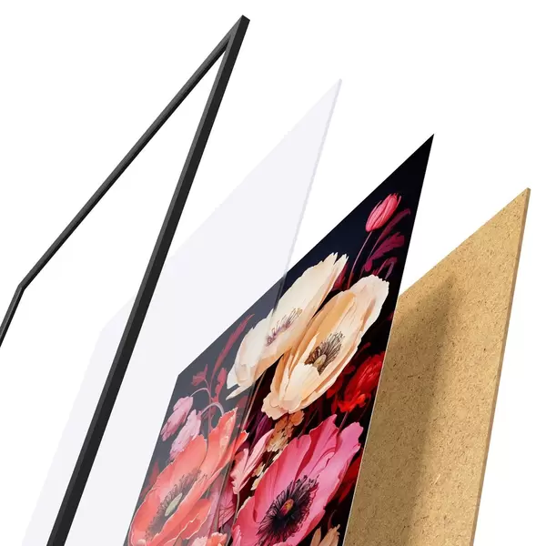 Le poster se compose d'un cadre, d'un plexiglas, d'une image imprimée et d'un support en aggloméré. Le poster peut être immédiatement accroché au mur grâce aux fixations au dos.