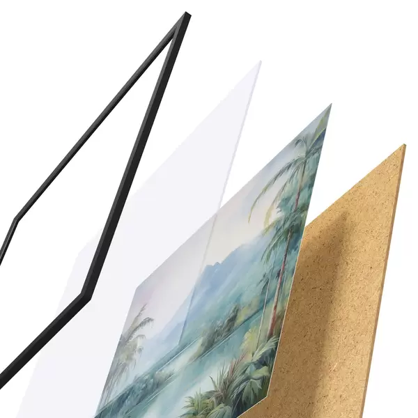 Le poster se compose d'un cadre, d'un plexiglas, d'une image imprimée et d'un support en aggloméré. Le poster peut être immédiatement accroché au mur grâce aux fixations au dos.