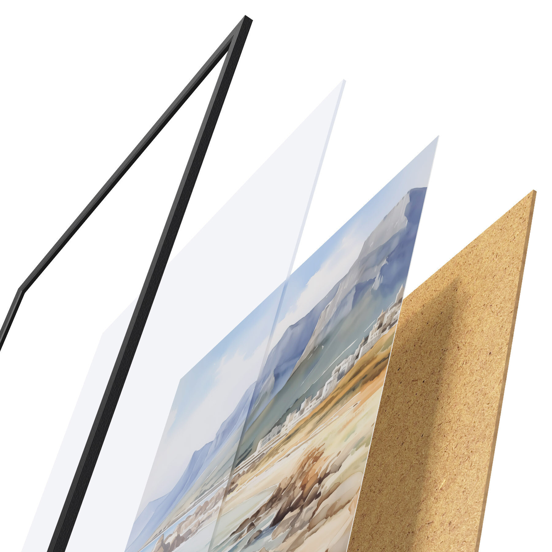 Le poster se compose d'un cadre, d'un plexiglas, d'une image imprimée et d'un support en aggloméré. Le poster peut être immédiatement accroché au mur grâce aux fixations au dos.