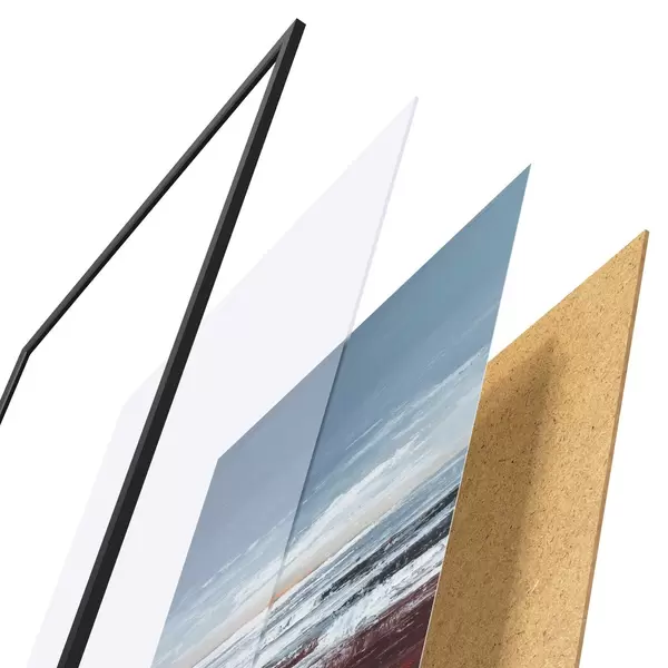 Le poster se compose d'un cadre, d'un plexiglas, d'une image imprimée et d'un support en aggloméré. Le poster peut être immédiatement accroché au mur grâce aux fixations au dos.