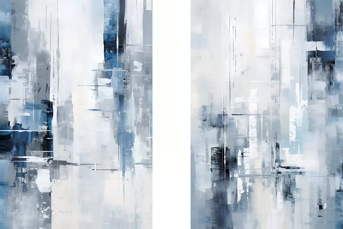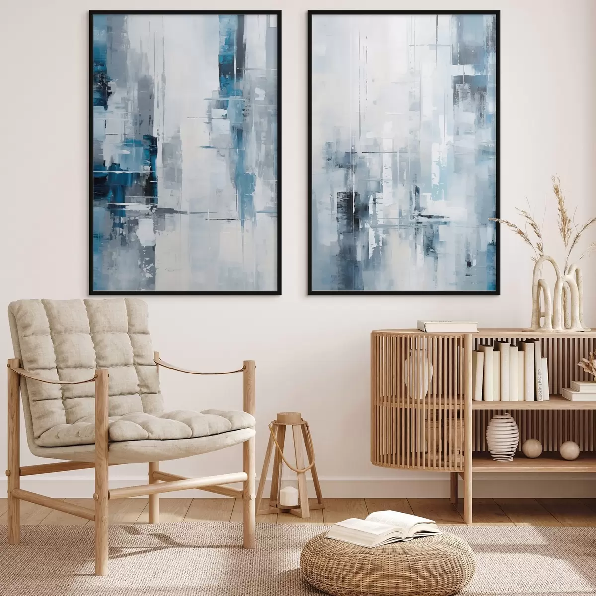 Affiche Imitation de peinture abstraite avec des couleurs bleues, grises et blanches, des lignes verticales et des formes géométriques d00819
