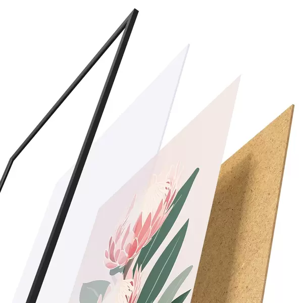 Le poster se compose d'un cadre, d'un plexiglas, d'une image imprimée et d'un support en aggloméré. Le poster peut être immédiatement accroché au mur grâce aux fixations au dos.