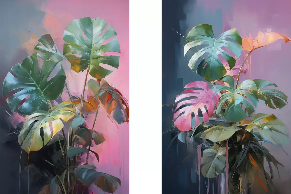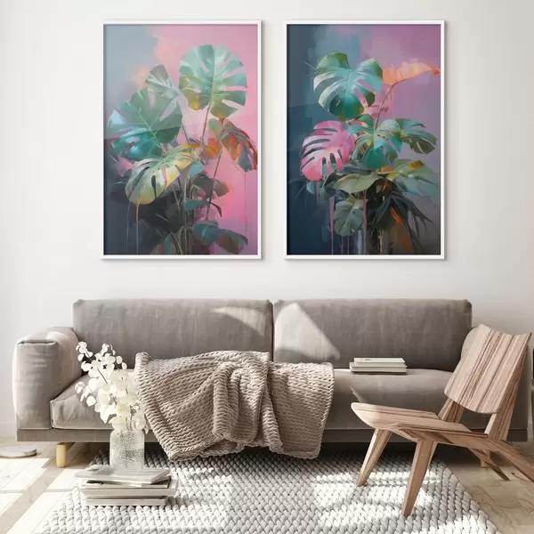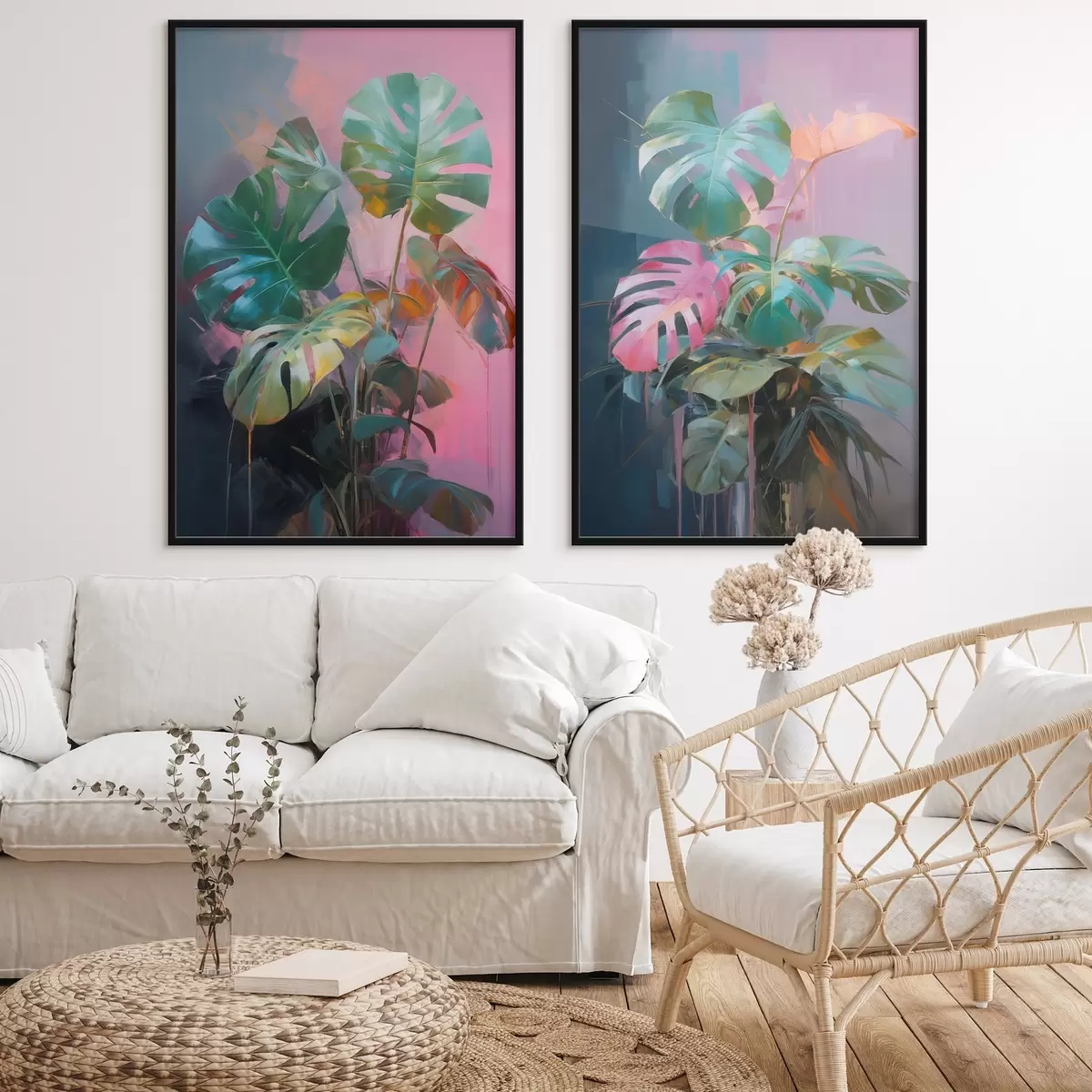 Affiche Plante abstraite monstera aux feuilles d'un vert éclatant, sur fond de douces teintes roses et violettes Non d00886