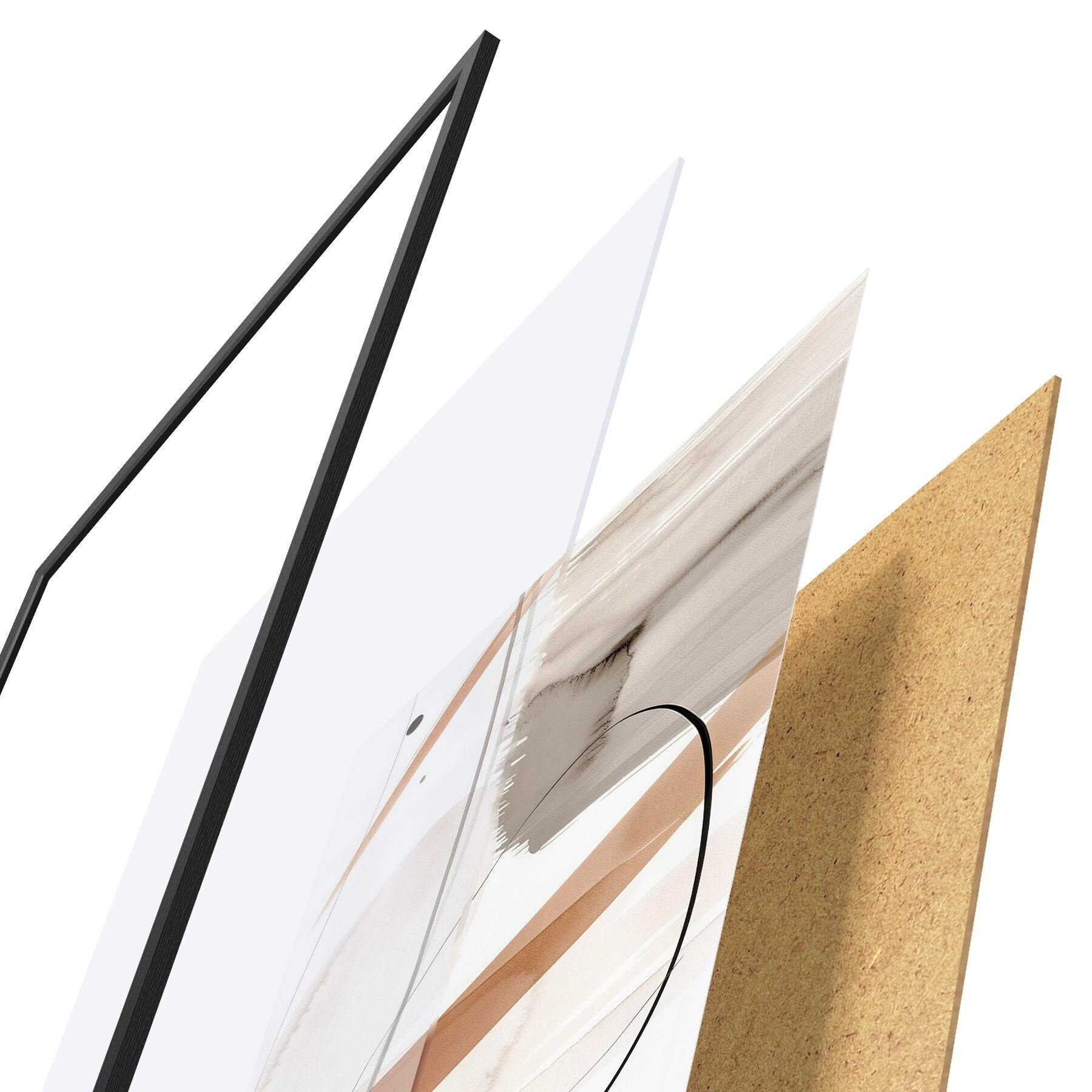 Le poster se compose d'un cadre, d'un plexiglas, d'une image imprimée et d'un support en aggloméré. Le poster peut être immédiatement accroché au mur grâce aux fixations au dos.