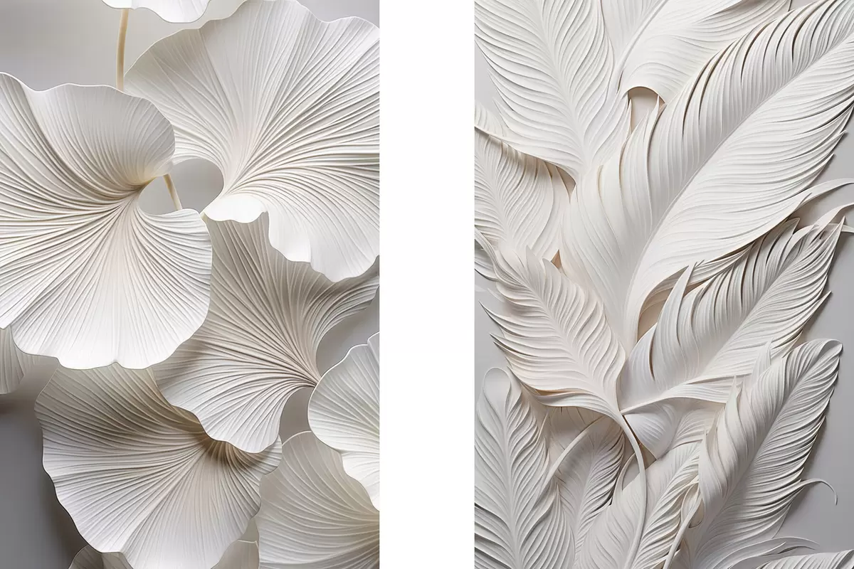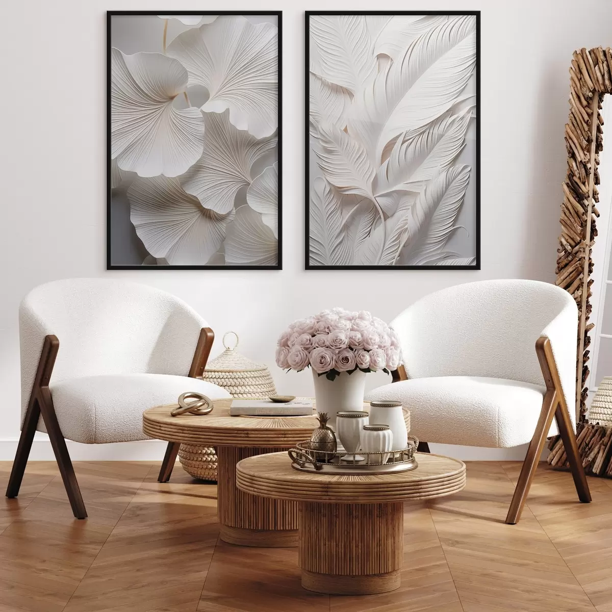 Affiche Feuilles de ginkgo blanches et longues feuilles aux détails complexes, créant un effet texturé et stratifié, art minimaliste. Non d01013
