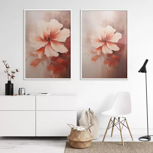 Affiche Composition florale : pétales blancs et crème, accents corail et fond brumeux délicat. Non d01088