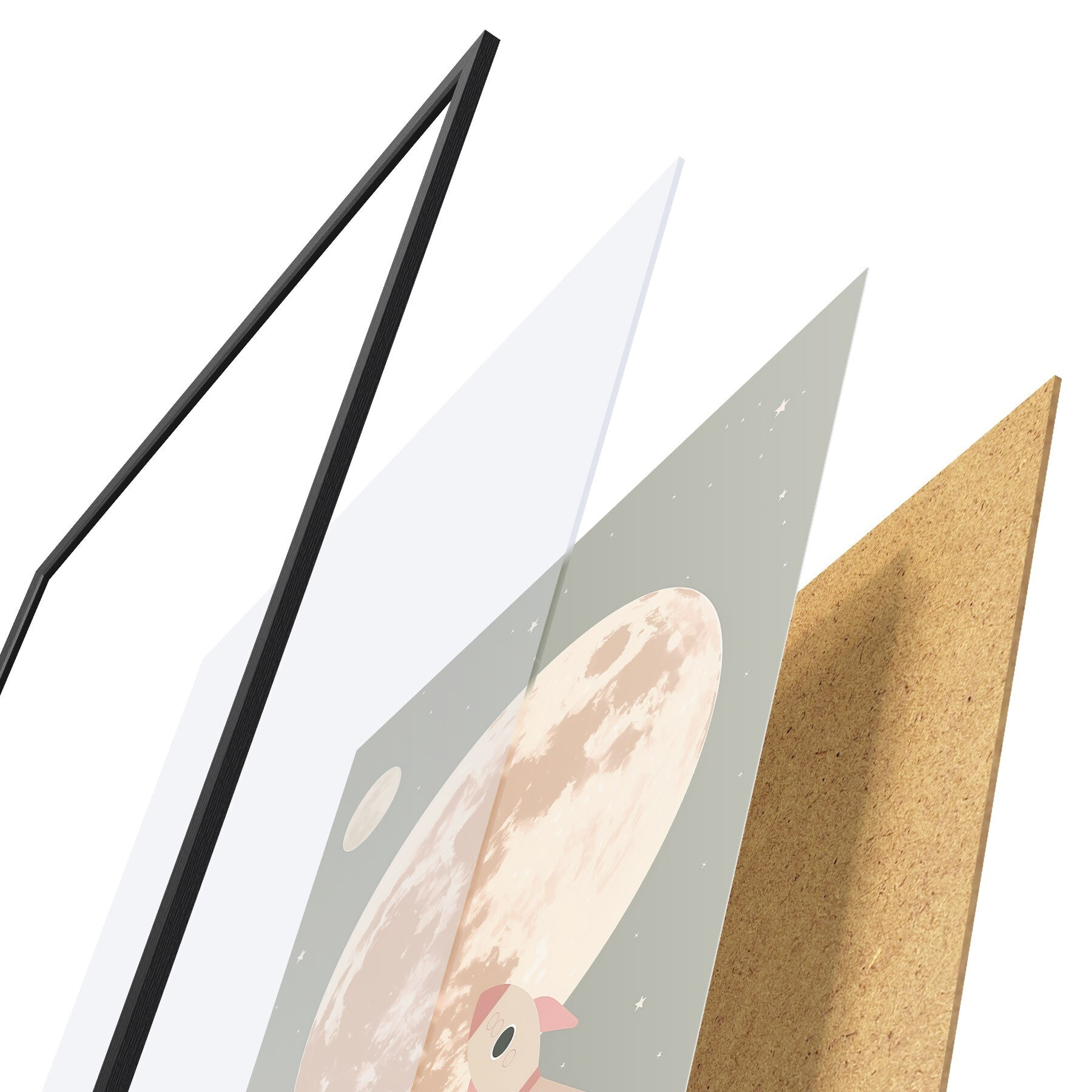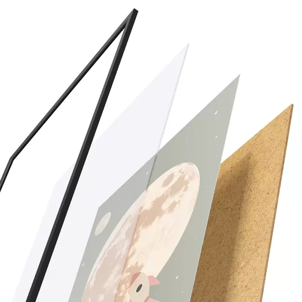 Le poster se compose d'un cadre, d'un plexiglas, d'une image imprimée et d'un support en aggloméré. Le poster peut être immédiatement accroché au mur grâce aux fixations au dos.