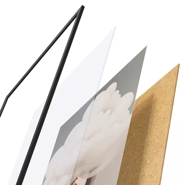 Le poster se compose d'un cadre, d'un plexiglas, d'une image imprimée et d'un support en aggloméré. Le poster peut être immédiatement accroché au mur grâce aux fixations au dos.