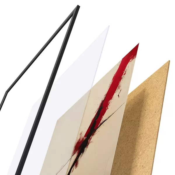 Le poster se compose d'un cadre, d'un plexiglas, d'une image imprimée et d'un support en aggloméré. Le poster peut être immédiatement accroché au mur grâce aux fixations au dos.