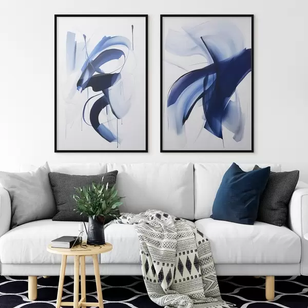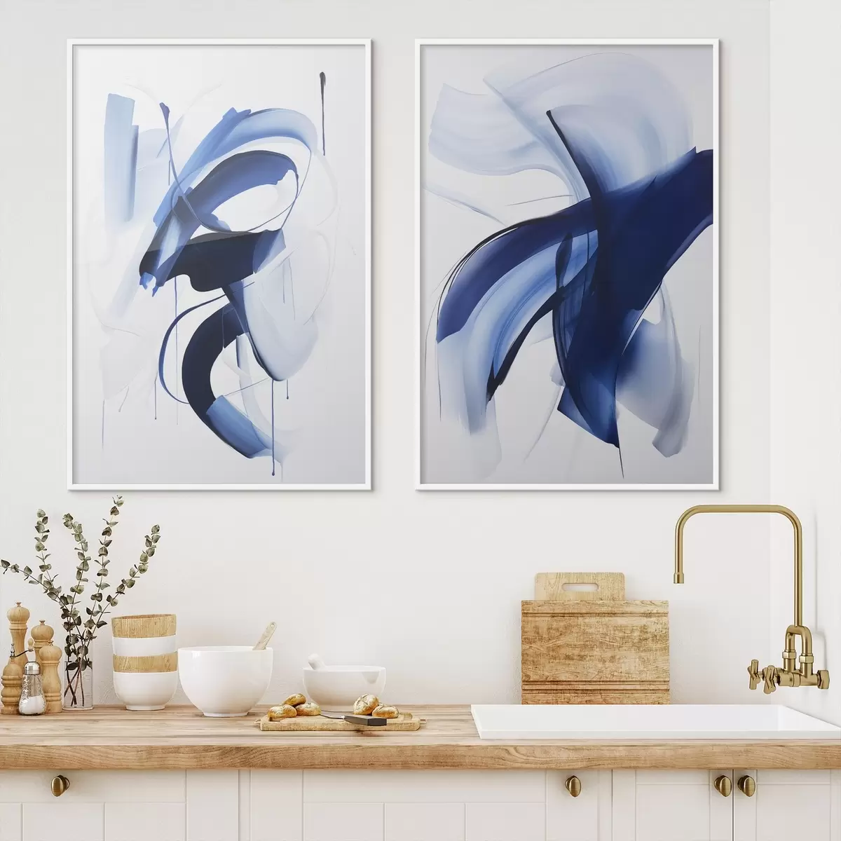Affiche Formes abstraites bleues ressemblant à des coups de pinceau, avec des lignes et des courbes fluides sur fond blanc, art moderne. Non d01240