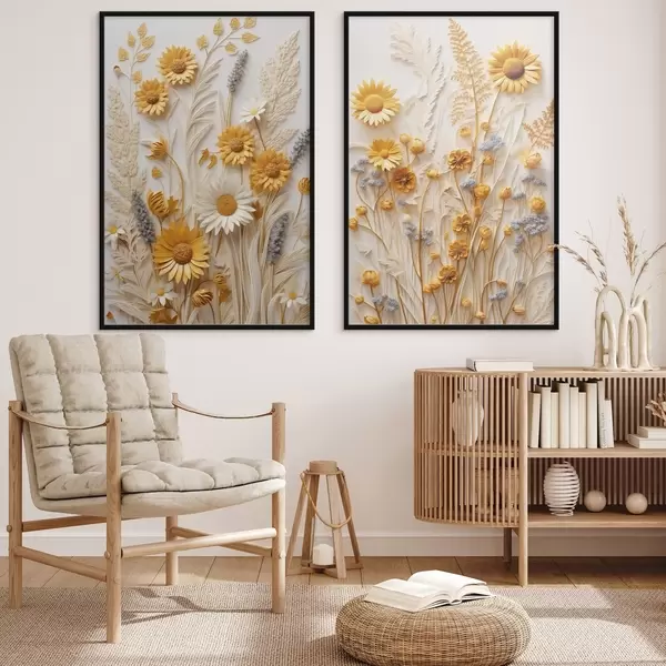Affiche Une collection texturée de marguerites jaunes et blanches avec des herbes séchées et des brins de lavande sur fond blanc. d01241