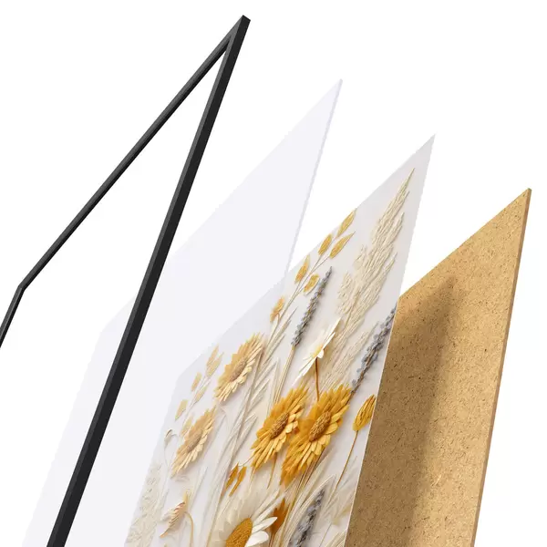 Le poster se compose d'un cadre, d'un plexiglas, d'une image imprimée et d'un support en aggloméré. Le poster peut être immédiatement accroché au mur grâce aux fixations au dos.