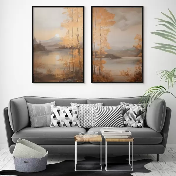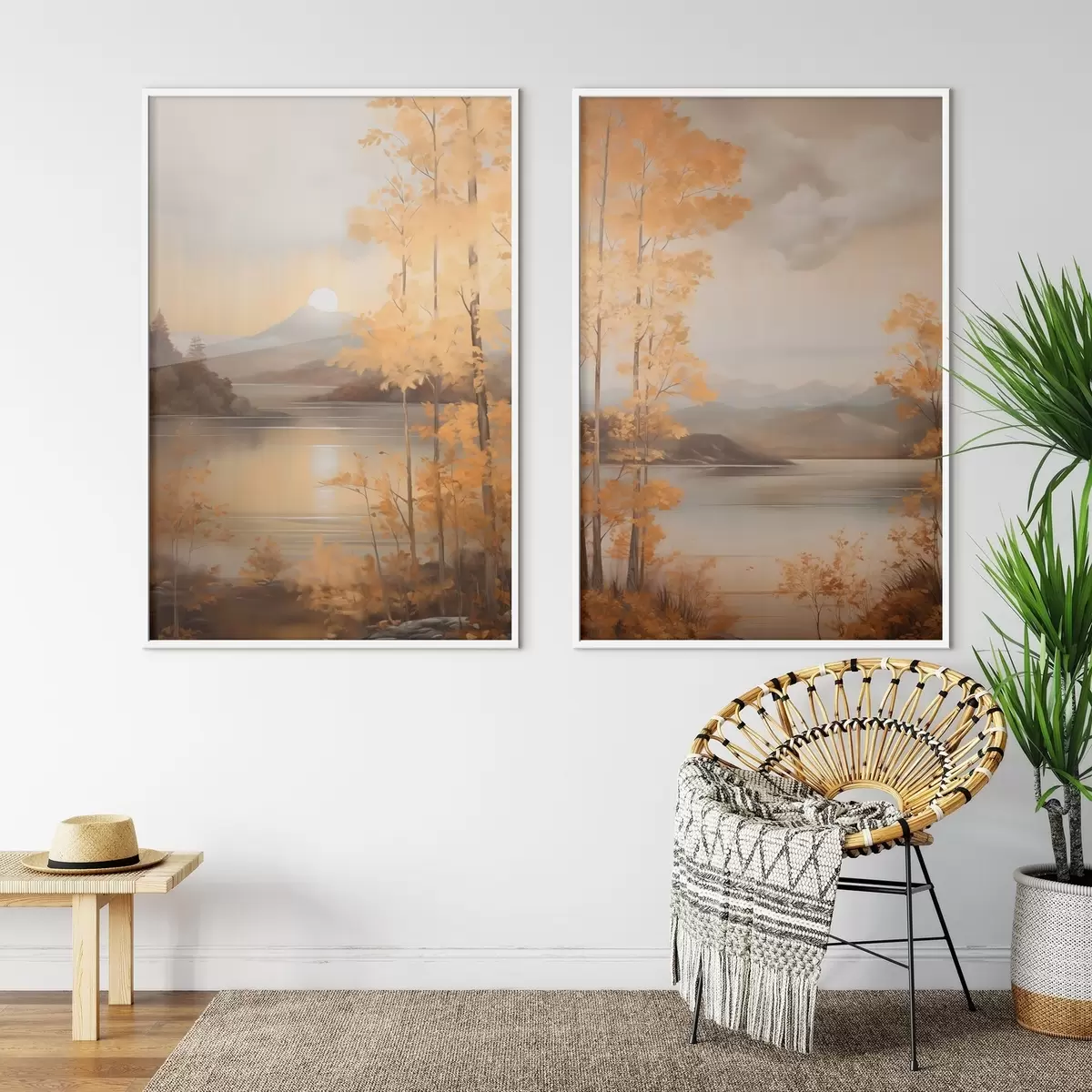 Affiche Des arbres aux feuilles orange, caractéristiques de l'automne, encadrent un lac paisible avec des montagnes lointaines sous un ciel nuageux. d01246
