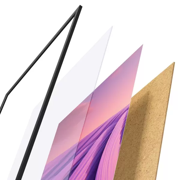 Le poster se compose d'un cadre, d'un plexiglas, d'une image imprimée et d'un support en aggloméré. Le poster peut être immédiatement accroché au mur grâce aux fixations au dos.