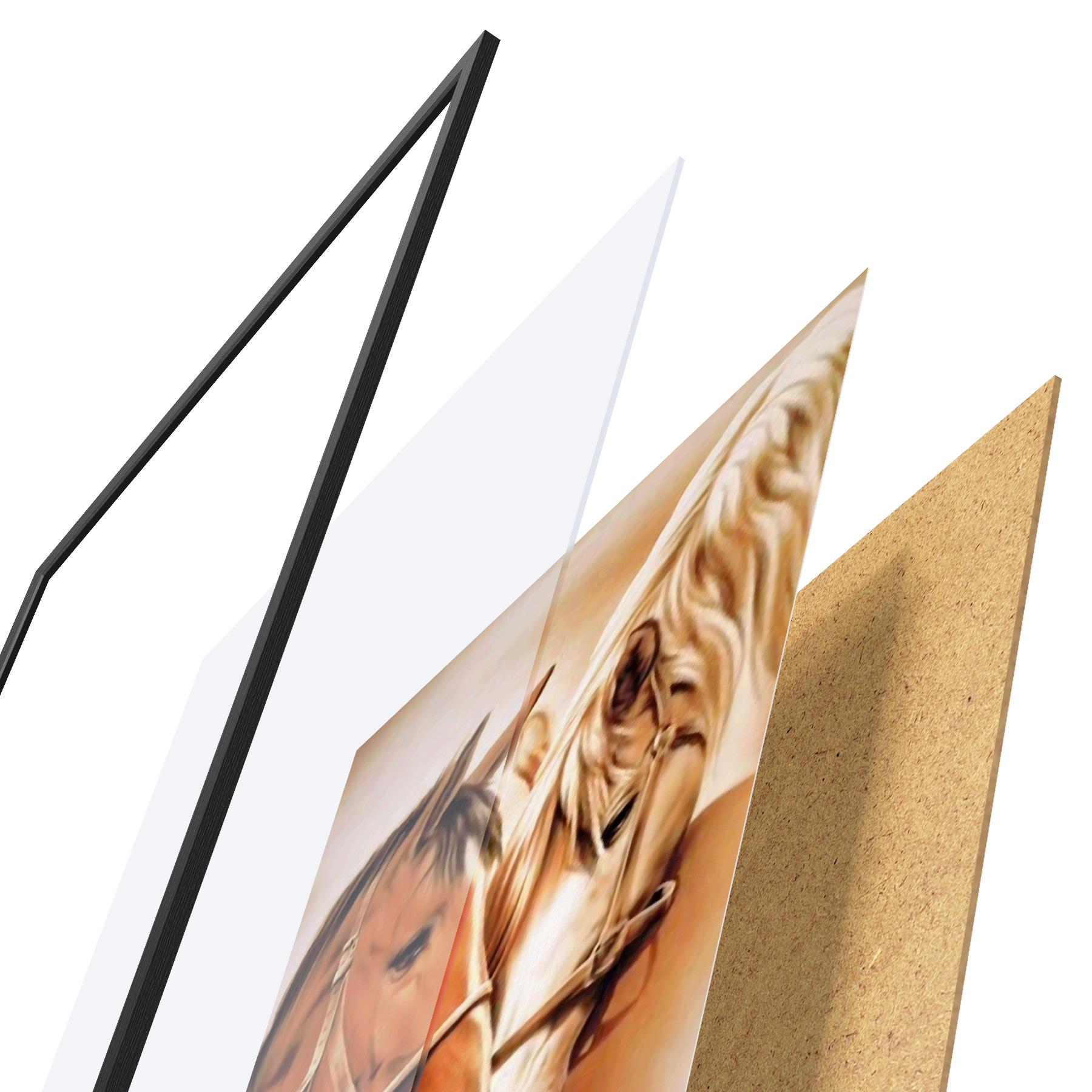 Le poster se compose d'un cadre, d'un plexiglas, d'une image imprimée et d'un support en aggloméré. Le poster peut être immédiatement accroché au mur grâce aux fixations au dos.