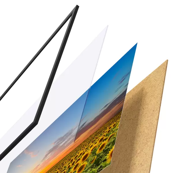 Le poster se compose d'un cadre, d'un plexiglas, d'une image imprimée et d'un support en aggloméré. Le poster peut être immédiatement accroché au mur grâce aux fixations au dos.