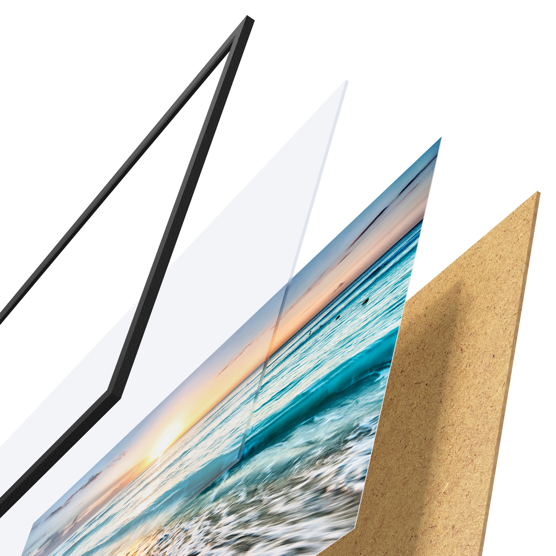 Le poster se compose d'un cadre, d'un plexiglas, d'une image imprimée et d'un support en aggloméré. Le poster peut être immédiatement accroché au mur grâce aux fixations au dos.