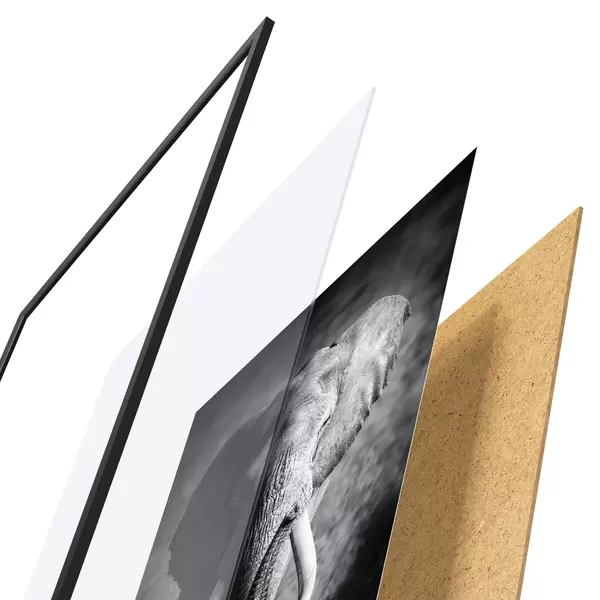 Le poster se compose d'un cadre, d'un plexiglas, d'une image imprimée et d'un support en aggloméré. Le poster peut être immédiatement accroché au mur grâce aux fixations au dos.