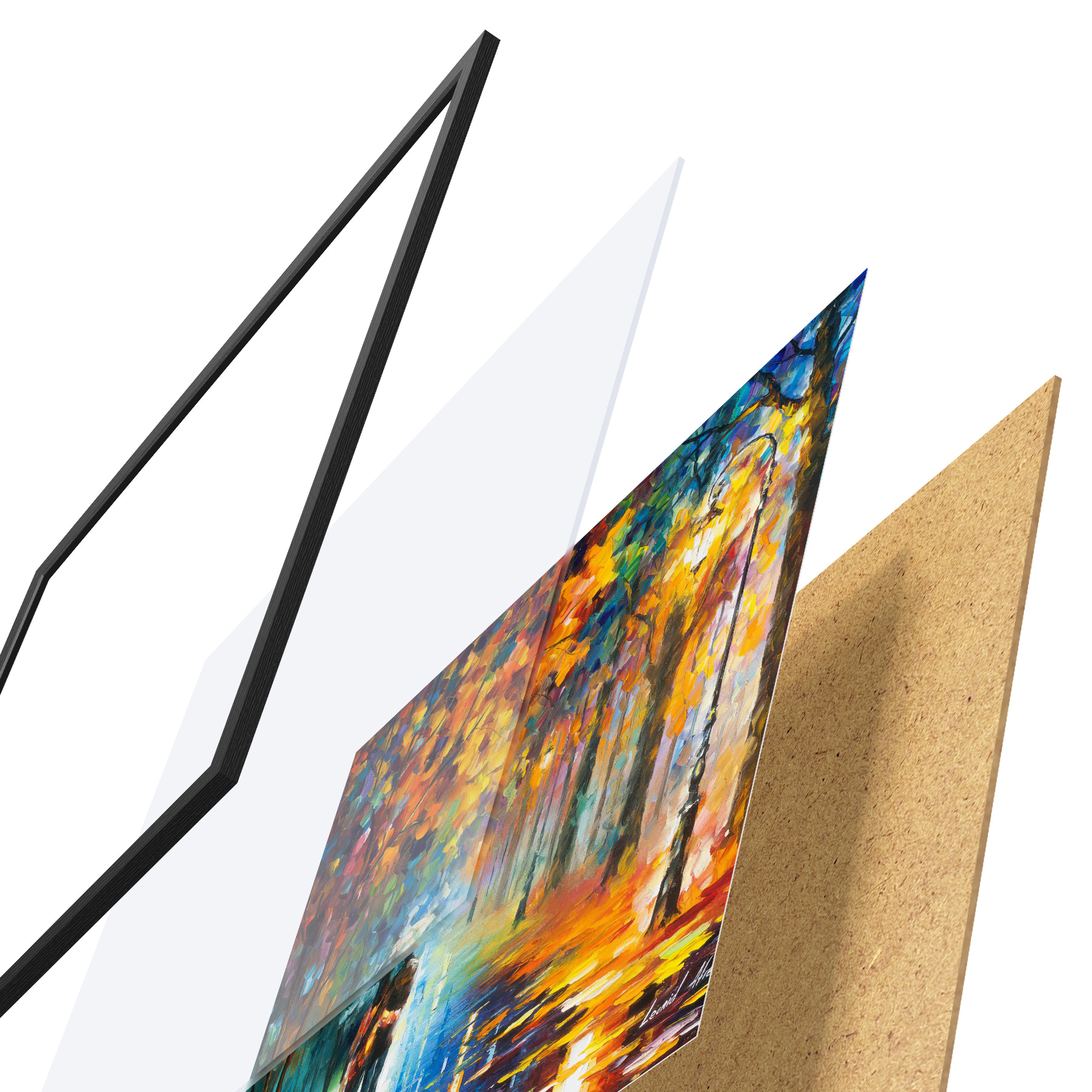 Le poster se compose d'un cadre, d'un plexiglas, d'une image imprimée et d'un support en aggloméré. Le poster peut être immédiatement accroché au mur grâce aux fixations au dos.