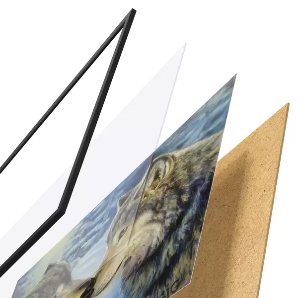 Le poster se compose d'un cadre, d'un plexiglas, d'une image imprimée et d'un support en aggloméré. Le poster peut être immédiatement accroché au mur grâce aux fixations au dos.