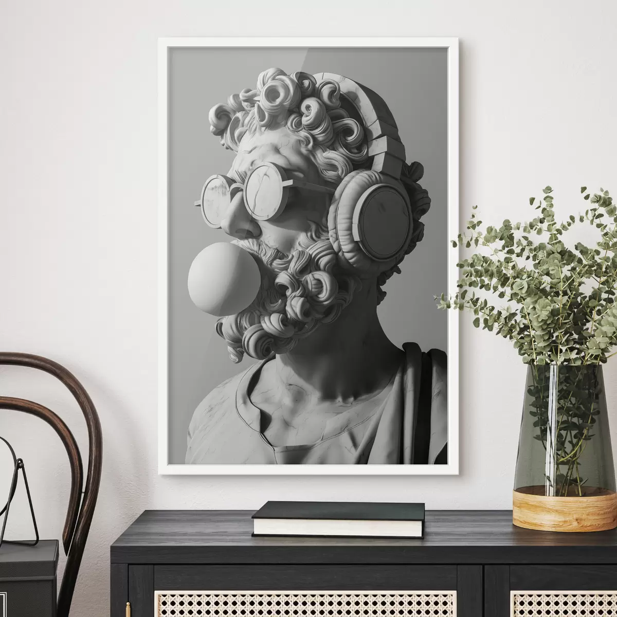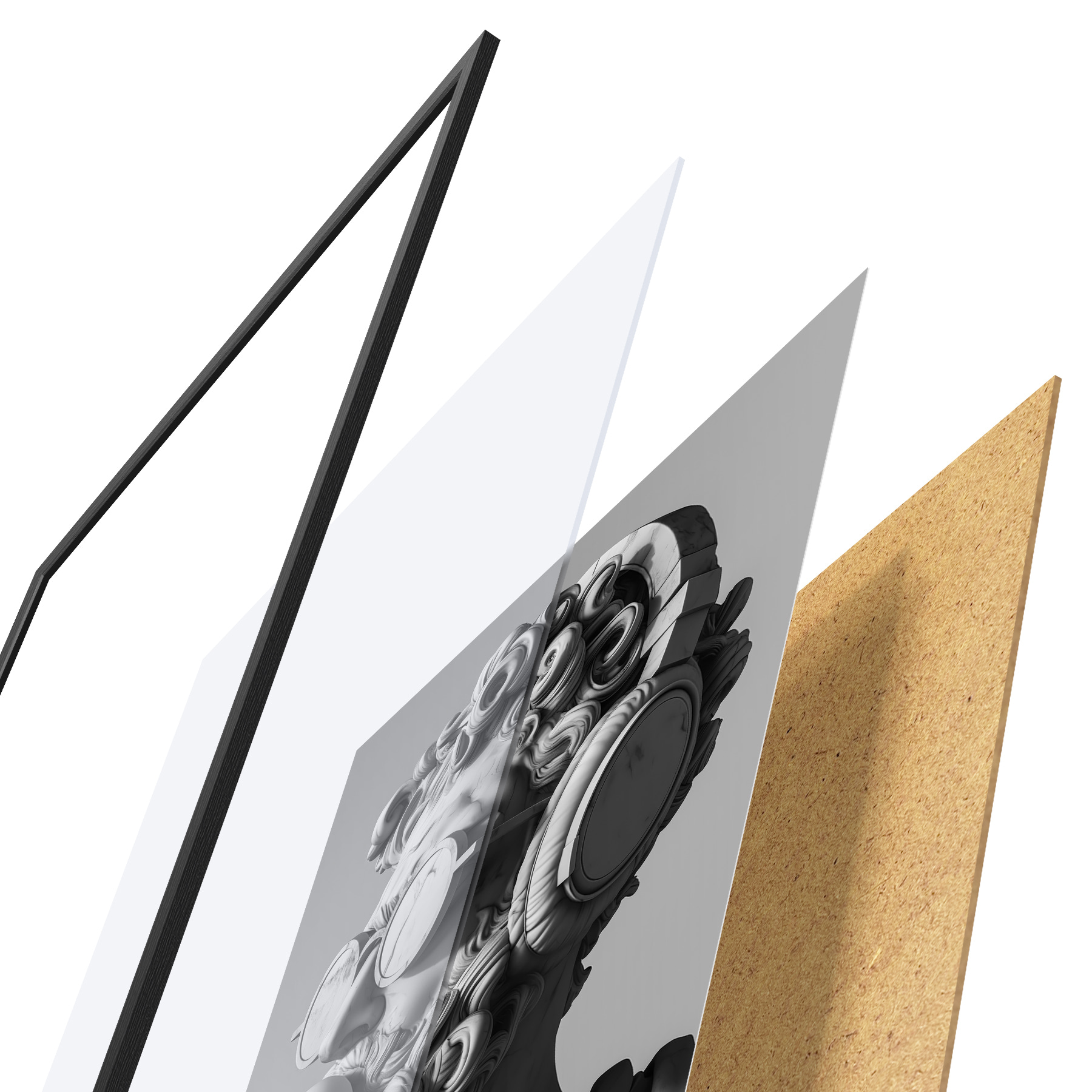 Le poster se compose d'un cadre, d'un plexiglas, d'une image imprimée et d'un support en aggloméré. Le poster peut être immédiatement accroché au mur grâce aux fixations au dos.