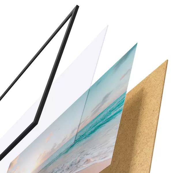Le poster se compose d'un cadre, d'un plexiglas, d'une image imprimée et d'un support en aggloméré. Le poster peut être immédiatement accroché au mur grâce aux fixations au dos.