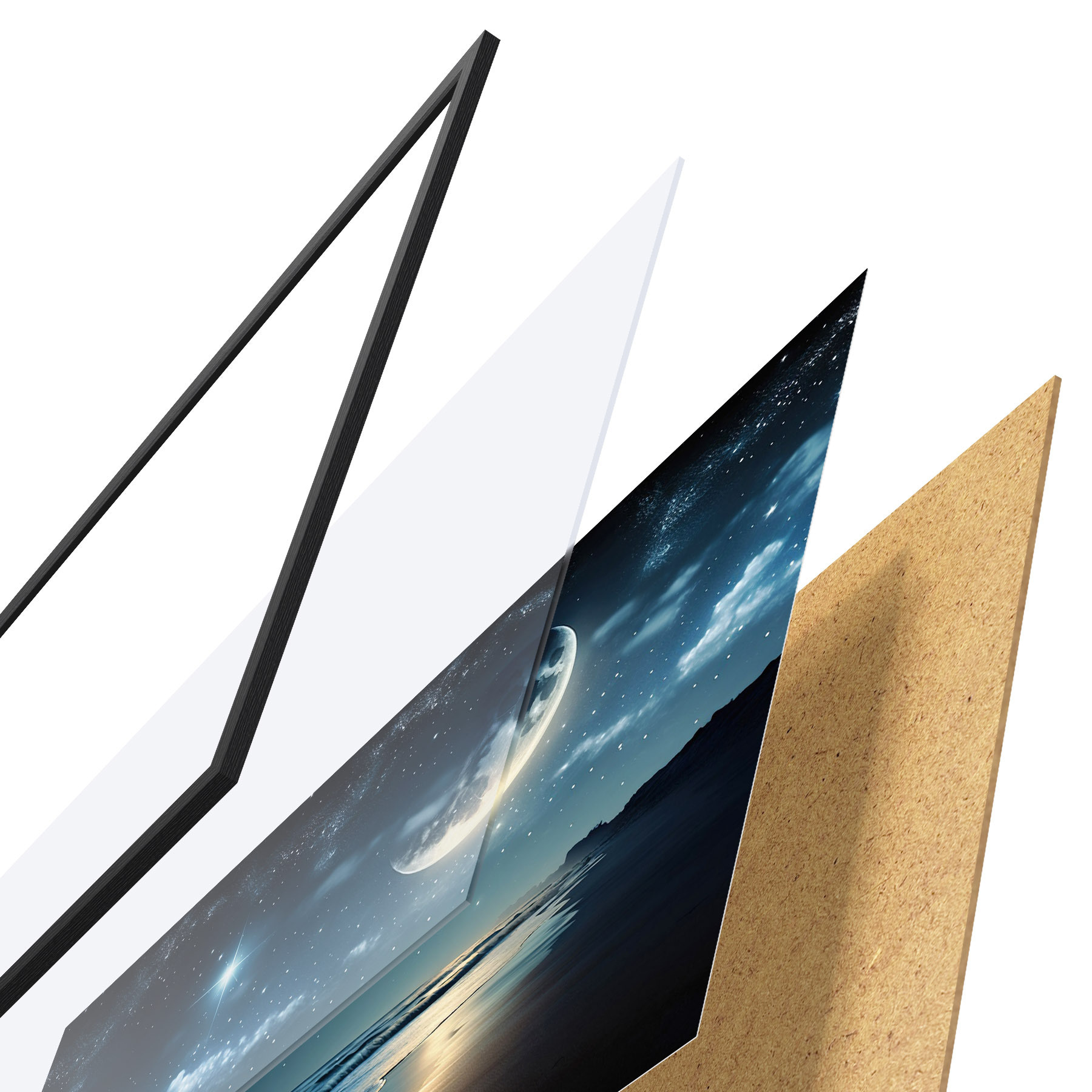 Le poster se compose d'un cadre, d'un plexiglas, d'une image imprimée et d'un support en aggloméré. Le poster peut être immédiatement accroché au mur grâce aux fixations au dos.