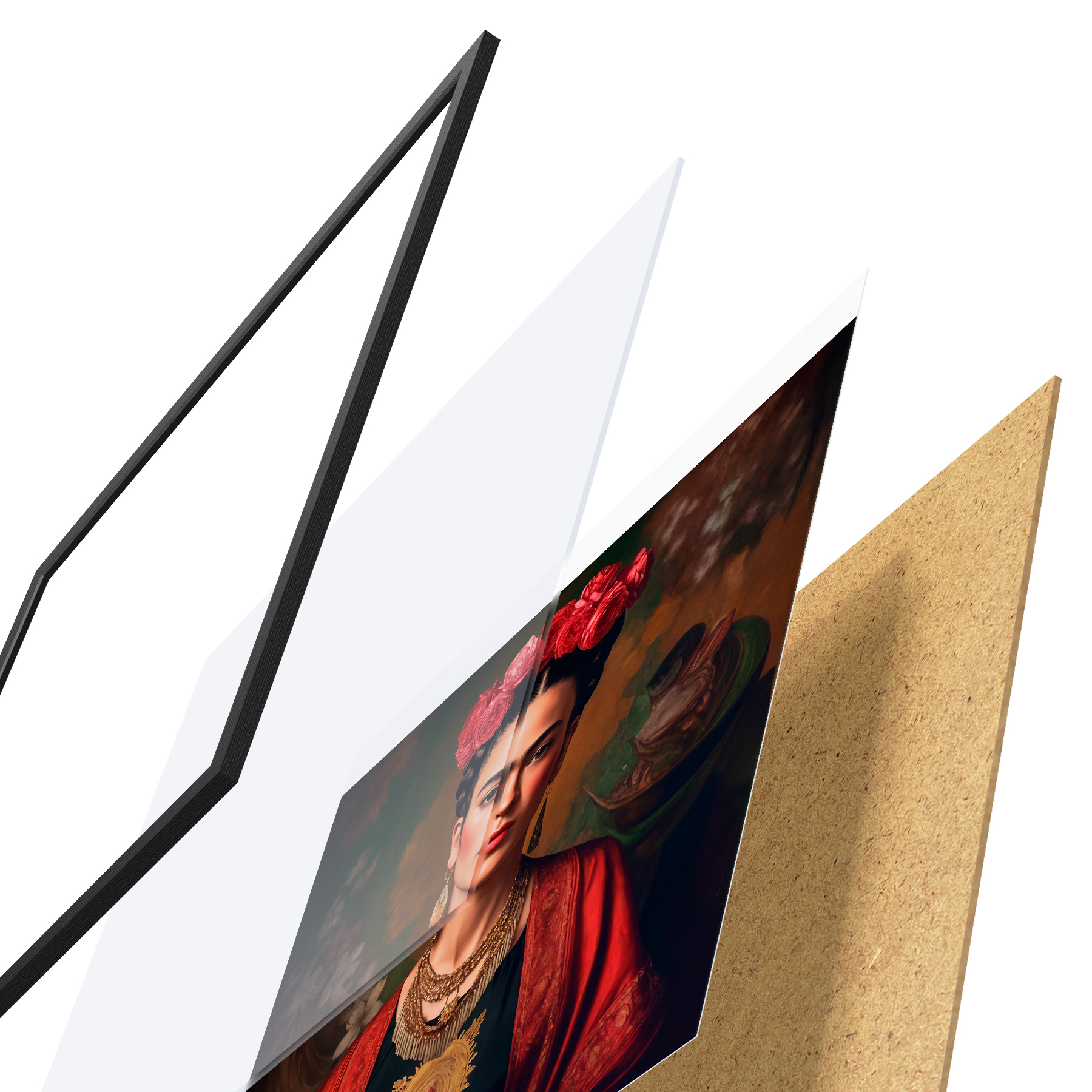 Le poster se compose d'un cadre, d'un plexiglas, d'une image imprimée et d'un support en aggloméré. Le poster peut être immédiatement accroché au mur grâce aux fixations au dos.